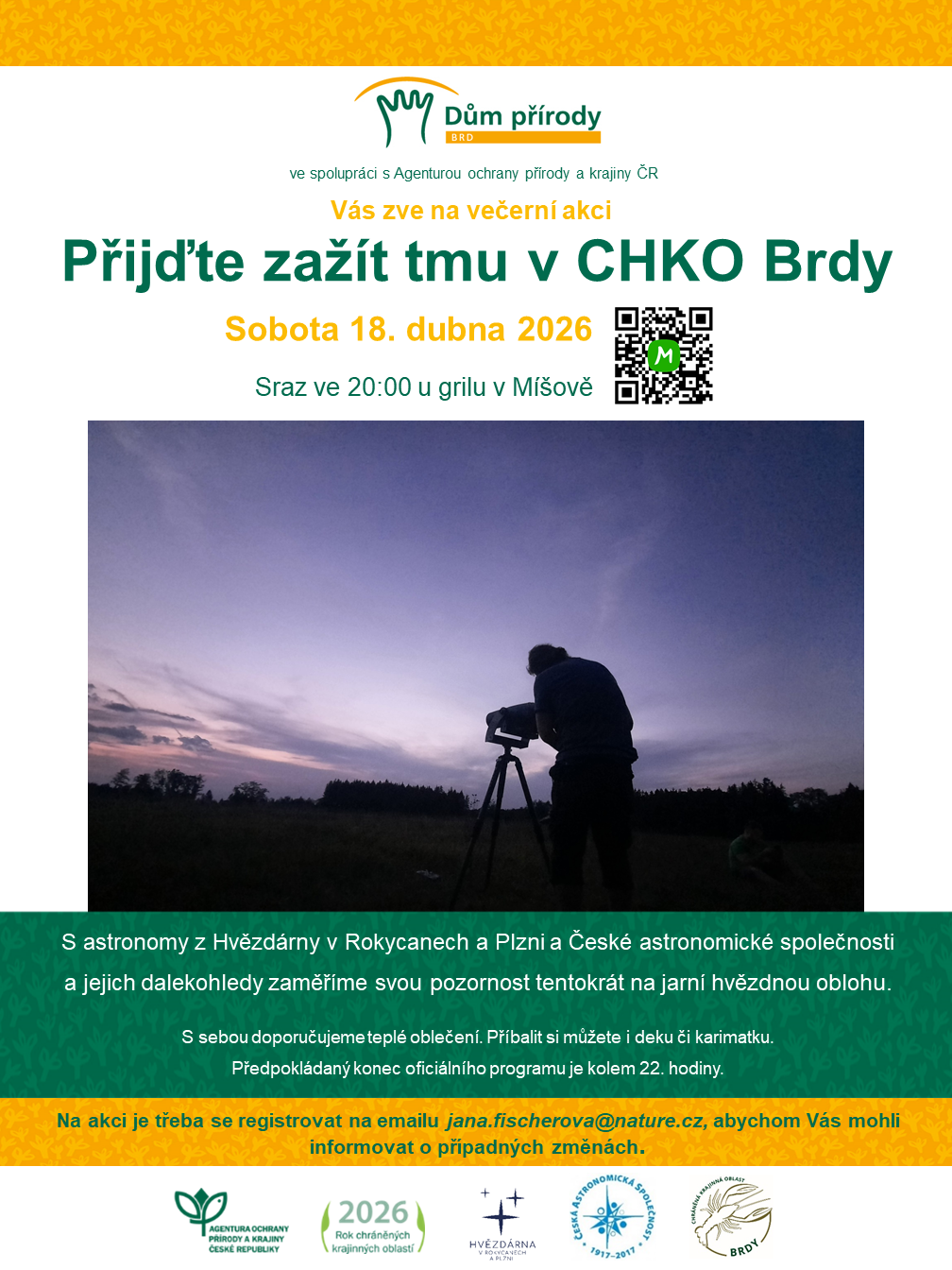 Pokud se k nám chcete připojit, registrujte se prosím na jana.fischerova@aopk.gov.cz. Pak už stačí se jen teple obléknout, případně vzít termosku s teplým čajem a karimatku a užít si tmu s námi.